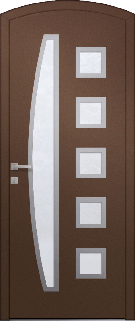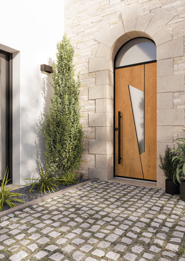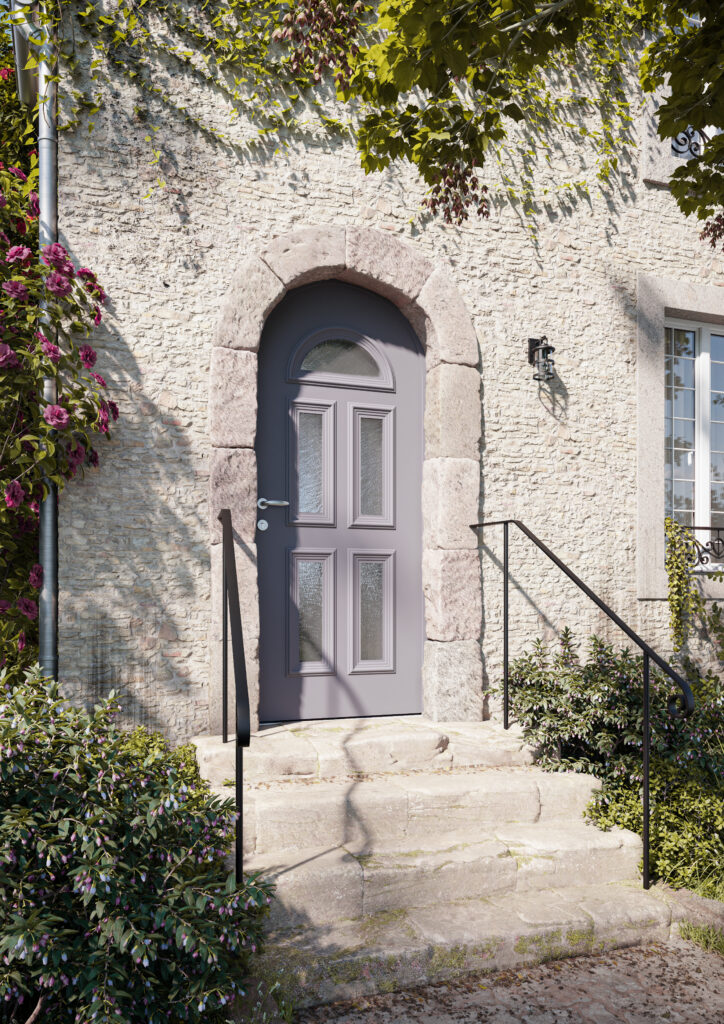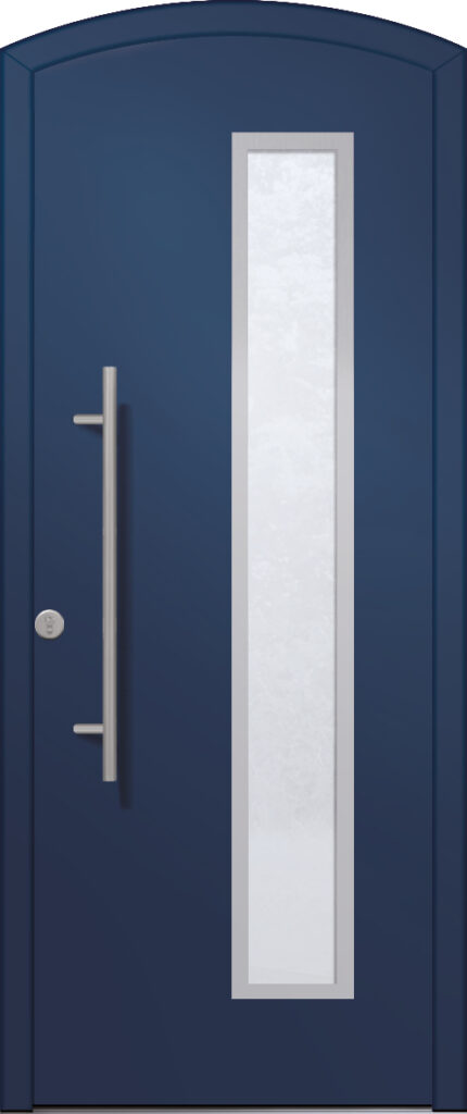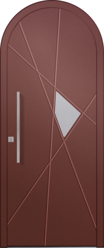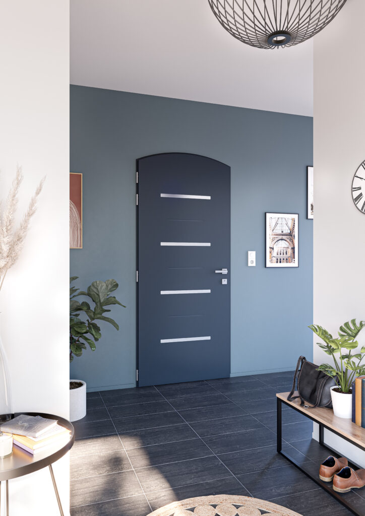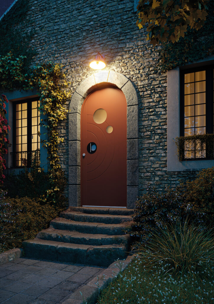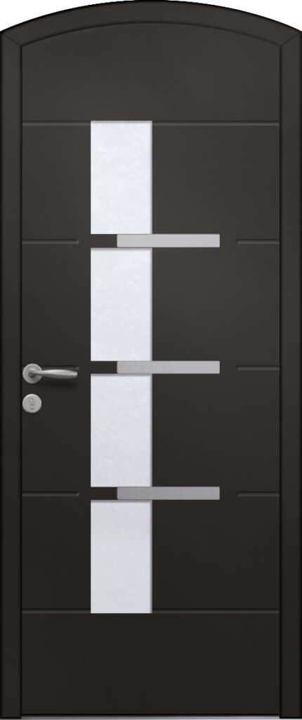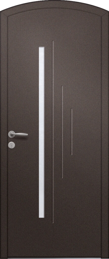 - Porte d’entrée cintrée avec imposte plein cintre et arc surbaissé : une version qui accentue la luminosité intérieure tout en conservant la solidité et l’élégance caractéristiques de la gamme.