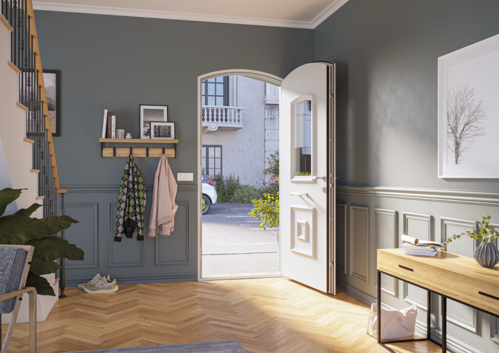 - Porte d’entrée cintrée à un vantail plein cintre avec arc surbaissé : un modèle raffiné qui apporte caractère et authenticité à la façade.